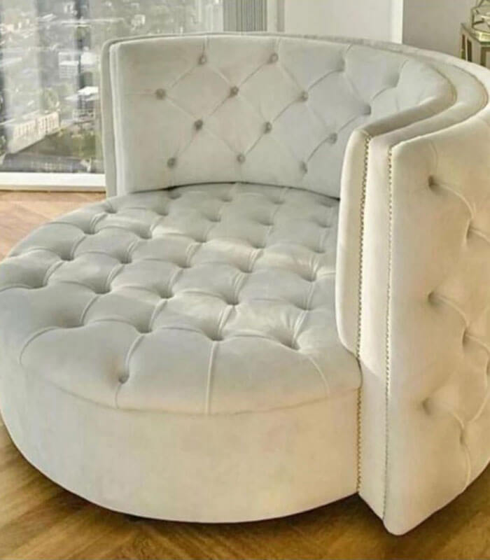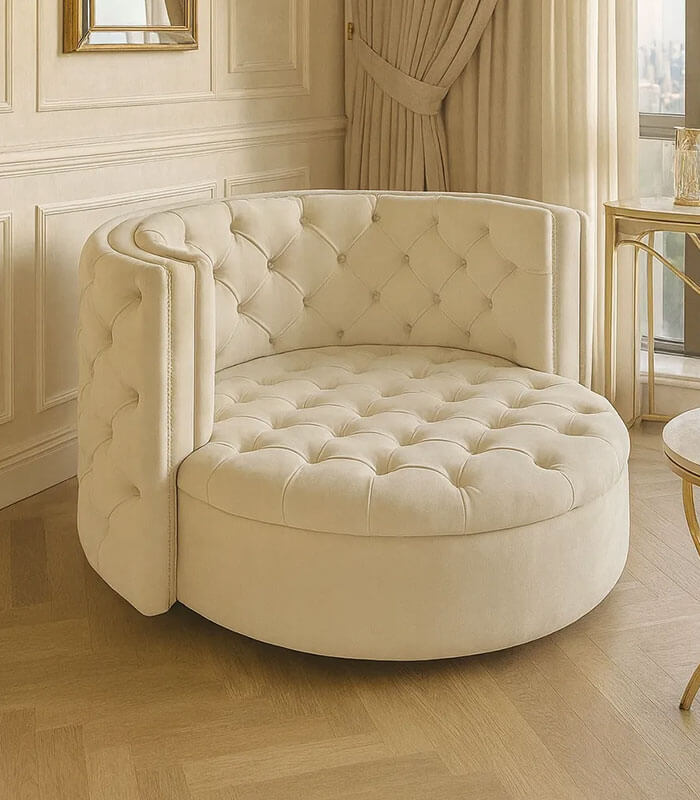 Elevate your interior with this luxury swivel chair , designed to bring refined elegance and modern comfort into any sophisticated living space. Featuring a beautifully diamond-tufted backrest, plush cushioned seating, and a smooth 360-degree swivel base, this chair blends timeless craftsmanship with contemporary luxury.